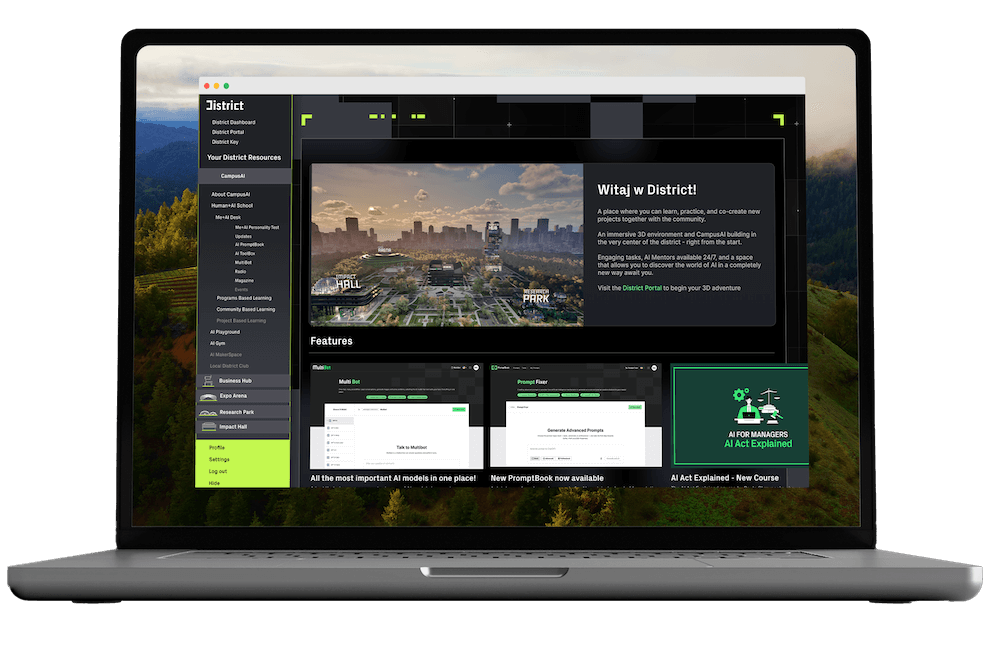 Wszystkie rozwiązania wprowadzone przez Campus AI za wyjątkiem interaktywnego świata 3D District wymagają przeglądarki internetowej i/lub smartfona. Nie musisz mieć bardzo mocnej karty graficznej, ani przestrzeni dyskowej. Jeśli na Twoim sprzęcie płynnie odtwarzają się filmy (np. działa Ci popularny YouTube) – to wystarczy 🙂